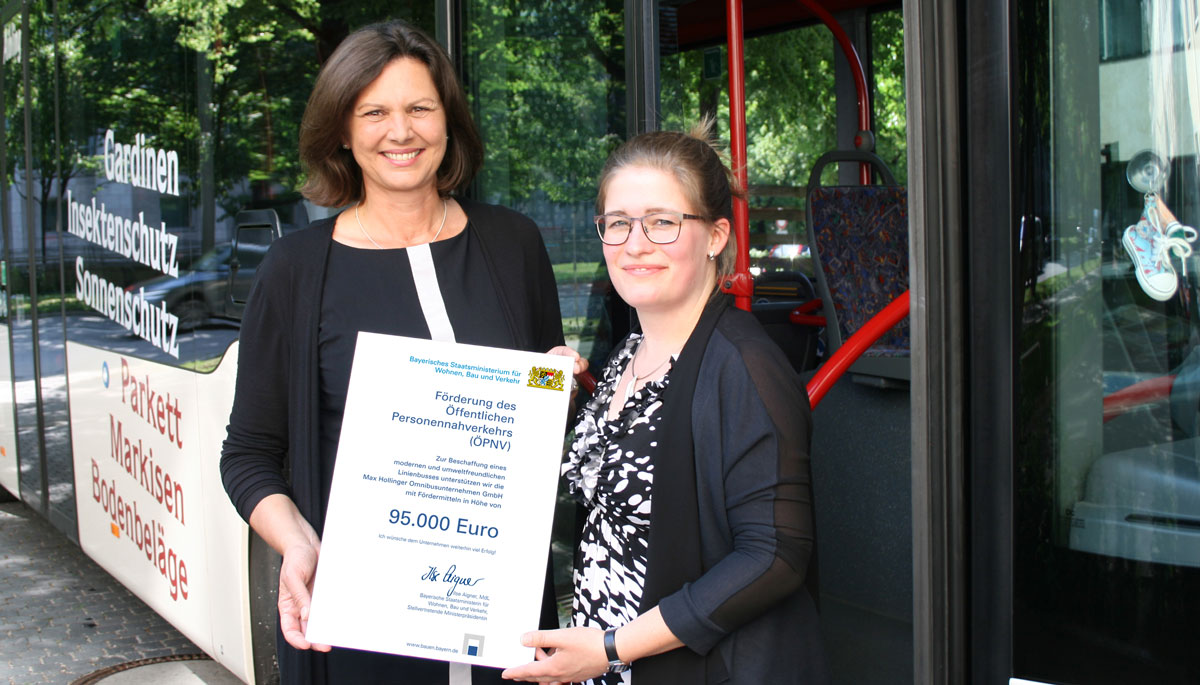 München, 5. Juni 2018 (stmb). Der Freistaat Bayern fördert den Öffentlichen Personennahverkehr (ÖPNV): Bei der Beschaffung neuer Busse bekommen Verkehrsunternehmen rund 30 Prozent der Kosten erstattet. Bayerns Verkehrsministerin Ilse Aigner hat jetzt exemplarisch einem oberbayerischen Bus-Unternehmen einen Förderbescheid über 95.000 Euro übergeben und am Bus ein Signet angebracht, das die Förderung sichtbar macht.