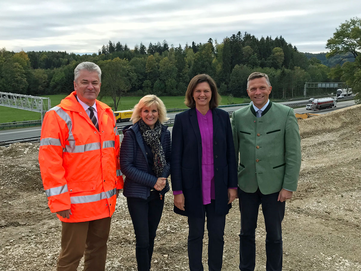 Dettendorf, 2. Oktober 2018 (stmb). Nachträglicher Lärmschutz für den Ortsteil Dettendorf im Landkreis Rosenheim: Bayerns Verkehrsministerin Ilse Aigner hat heute gemeinsam mit der Bundestagsabgeordneten Daniela Ludwig die Baustelle besichtigt, auf der bis Ende 2019 Lärmschutzwände bzw. Wall-/Wand-Kombinationen entstehen werden.