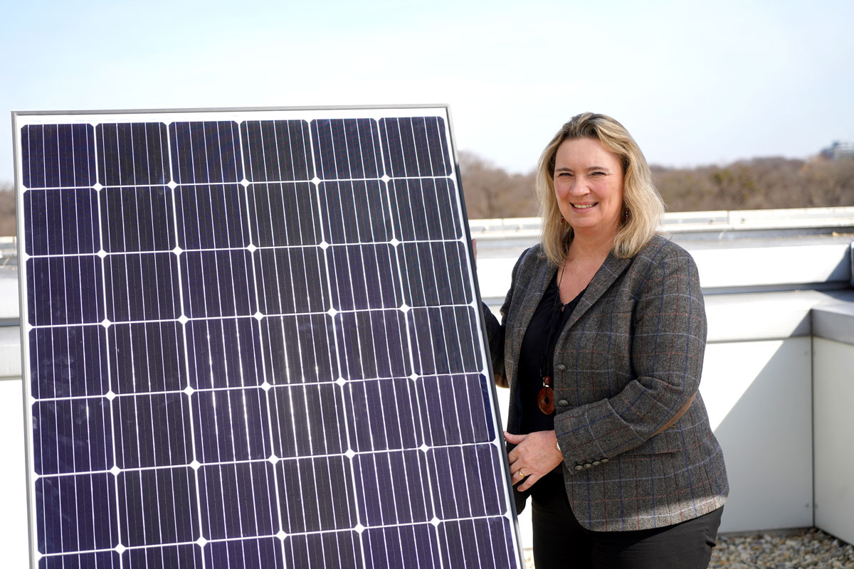 Bauministerin Kerstin Schreyer auf dem Dach des Ministeriums neben einer Photovoltaikanlage