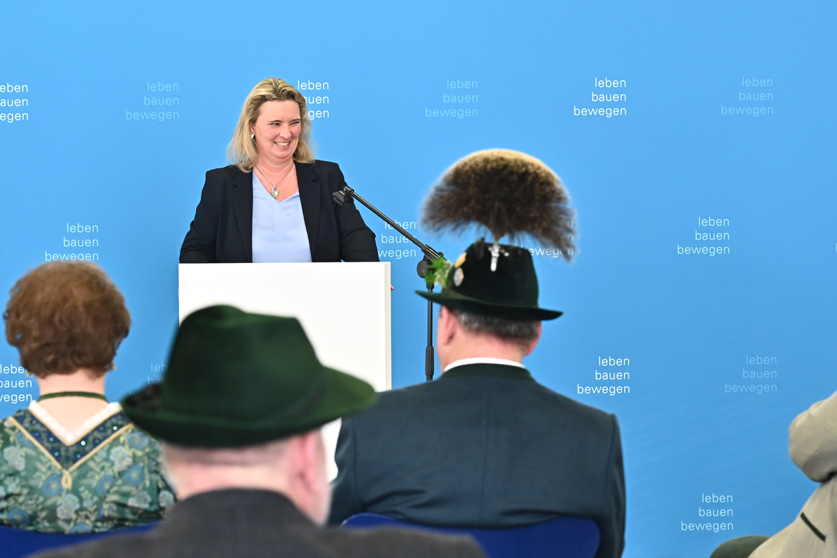 Staatsministerin Kerstin Schreyer am Mikrofon. Im Publikum sind von hinten einige Geehrte in Tracht zu erkennen