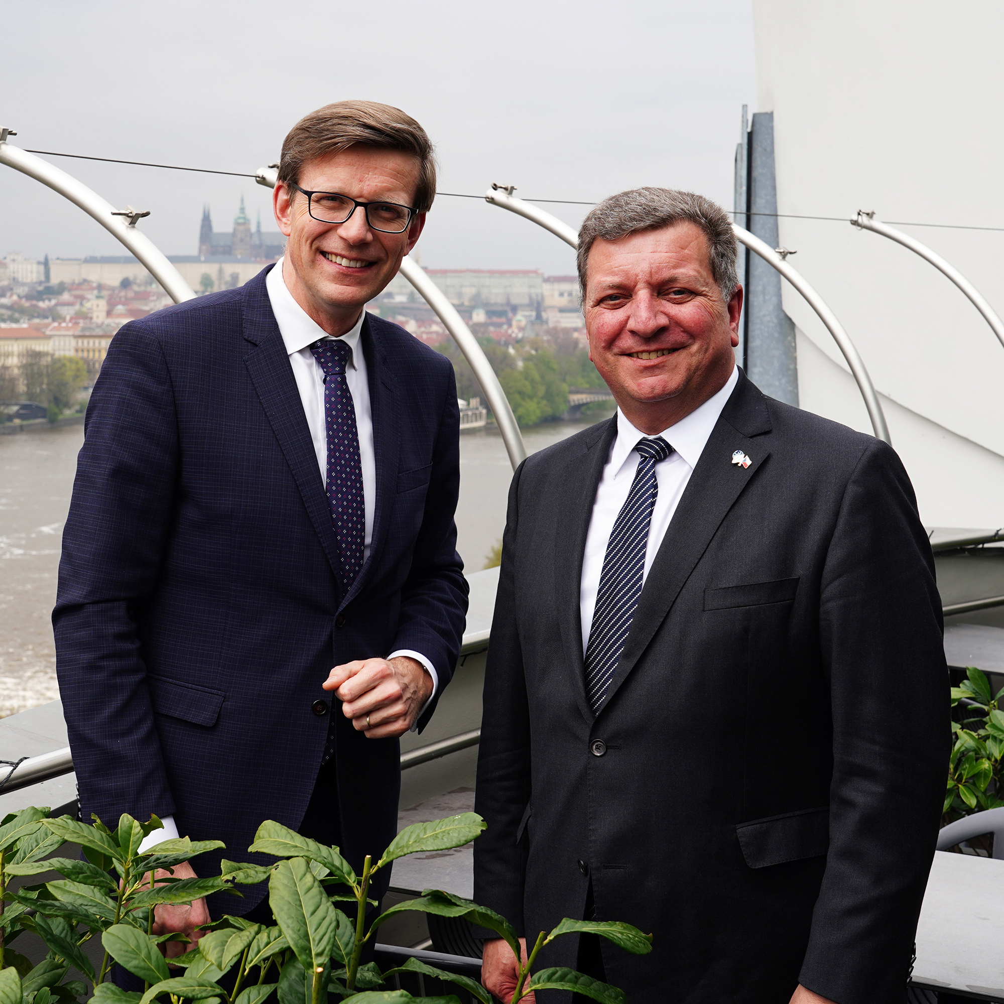 Prag, 20. April 2023. Bayerns Verkehrsminister Christian Bernreiter hat sich in Prag mit dem tschechischen Minister für Verkehr Martin Kupka über die Herausforderungen im länderverbindenden Verkehr zwischen Tschechien und Bayern ausgetauscht. Seit dem Ende des Eisernen Vorhangs und dem EU-Beitritt Tschechiens 2004 wächst die Grenzregion immer stärker zusammen.
