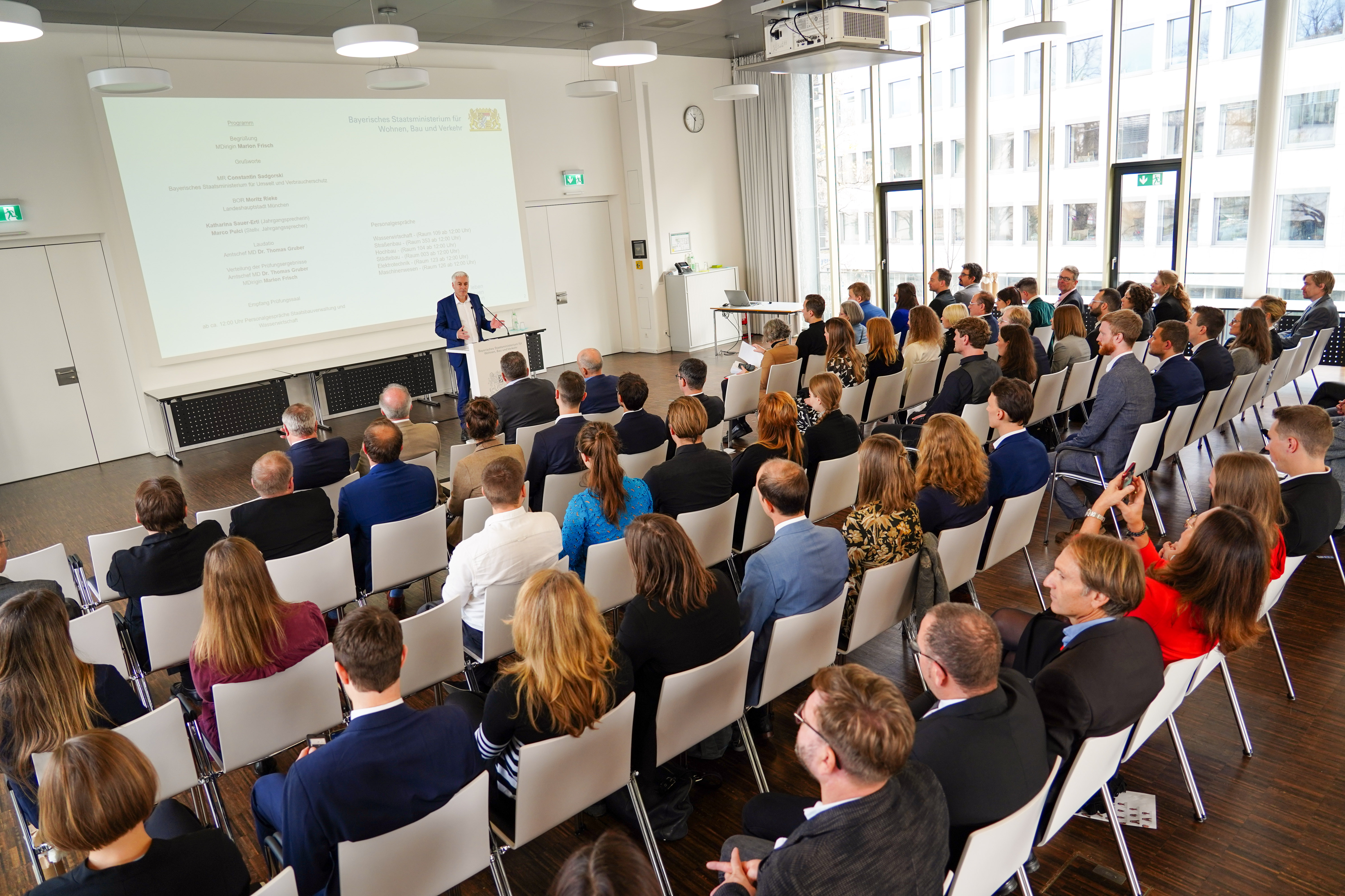 München, 23. November 2023. Ministerialdirektor Dr. Thomas Gruber, Amtschef im Bayerischen Bauministerium, gratulierte den 37 Regierungsbaumeisterinnen und Regierungsbaumeistern des Prüfungsjahrgangs 2023 aus den Fachbereichen Hochbau, Städtebau, Maschinenwesen/Elektrotechnik, Straßenbau und Wasserwirtschaft zur bestandenen Qualifikationsprüfung.