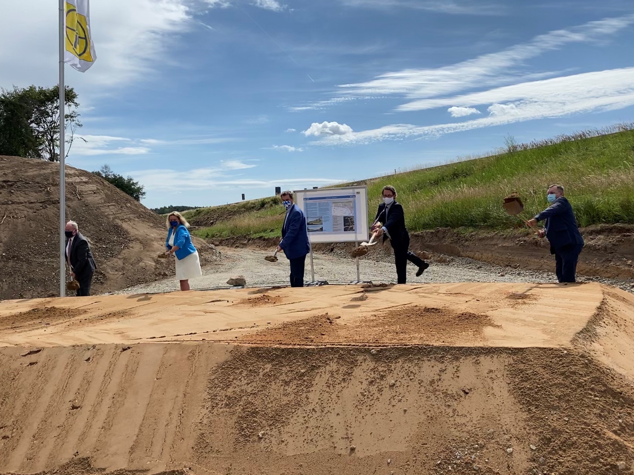 Manfred Wendt (Projektgesellschaft „A 3 Nordbayern GmbH & Co. KG“), Bayerns Verkehrsministerin Kerstin Schreyer, Bayerns Ministerpräsident Dr. Markus Söder, Bundesverkehrsminister Andreas Scheuer, Reinhard Pirner (Präsident der Autobahndirektion Nordbayern)