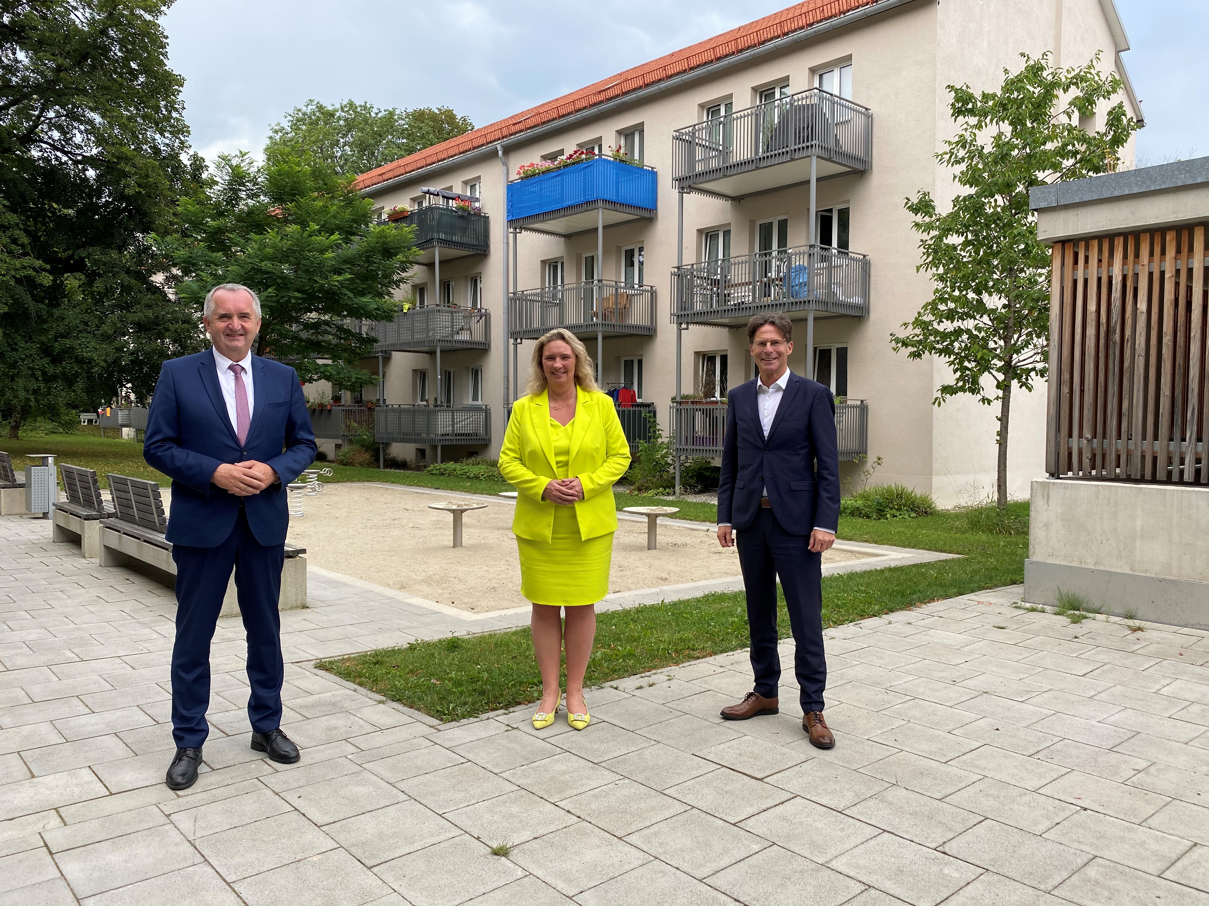 Im Anschluss an das Gespräch im Ministerium zeigte Schreyer ihrem Amtskollegen die Wohnanlage Passauerstraße in München, eines von insgesamt elf Modellprojekten in ganz Bayern aus dem Modellvorhaben „IQ – Innerstädtische Wohnquartiere“ des Experimentellen Wohnungsbaus. Sie steht beispielhaft für den innovativen Umgang für stark modernisierungsbedürftige Siedlungen der 30er und 50er Jahre. Die vorhandenen Gebäude mit insgesamt 366 nicht mehr zeitgemäßen Kleinwohnungen wurden saniert und in klimaschonender Holzbauweise aufgestockt. So konnten in vergleichsweise kurzer Zeit nicht nur 21 zusätzliche Wohneinheiten geschaffen, sondern auch die durchschnittliche Wohnungsgröße durch Umstrukturierungen im Bestand deutlich gesteigert und damit an heutige Wohnbedürfnisse angepasst werden. Durch die Aufwertung der vorhandenen Grünflächen und neue Gemeinschaftseinrichtungen entstand ein attraktives Stadtquartier mit vielfältigen Wohnungsangeboten zu bezahlbaren Mietpreisen, in dem sich Familien mit Kindern genauso wohlfühlen wie Paare und Singles. Neben dem kompletten Umbau, der Neustrukturierung und der Aufwertung der Bestandssiedlung konnten zudem 28 staatlich geförderte Wohnungen mit einem Förderdarlehen in Höhe von gut 2,25 Millionen Euro realisiert werden.