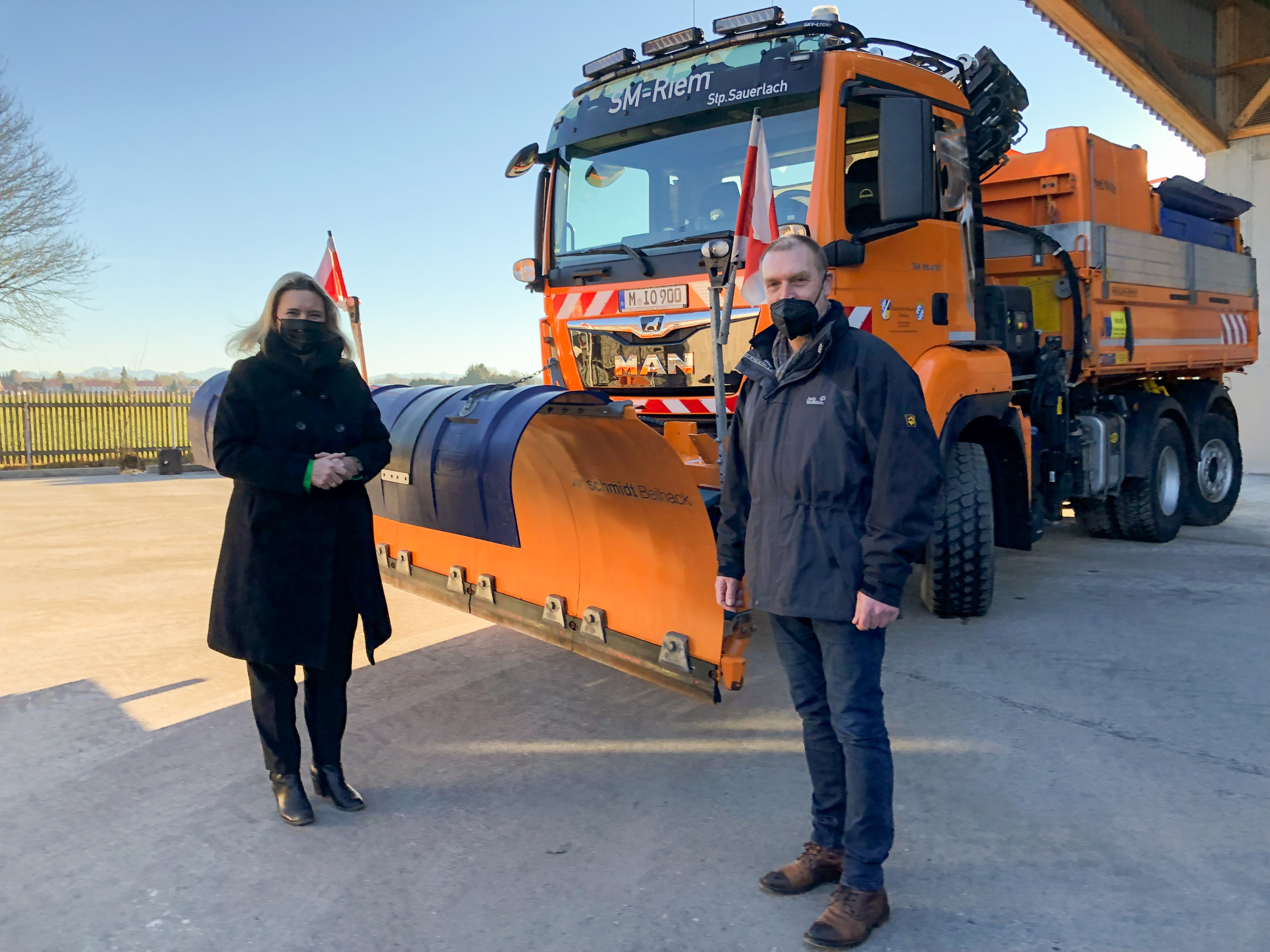 Der Winterdienst der Bayerischen Staatsbauverwaltung ist angesichts der Omikron-Variante gut aufgestellt. Davon hat sich Bayerns Verkehrsministerin Kerstin Schreyer heute am Stützpunkt Sauerlach der Straßenmeisterei Riem im Landkreis München überzeugt. „Wir sehen den Winterdienst als Teil der kritischen Infrastruktur, denn ohne geräumte Straßen würde das öffentliche Leben in weiten Teilen lahmliegen“, betonte die Ministerin. „Mit Blick auf Corona und die hochansteckende Omikron-Variante haben wir deshalb spezielle Hygienekonzepte entwickelt, damit der Winterdienst der Bayerischen Staatsbauverwaltung einsatzfähig bleibt und die Verkehrsteilnehmer sicher ankommen.“