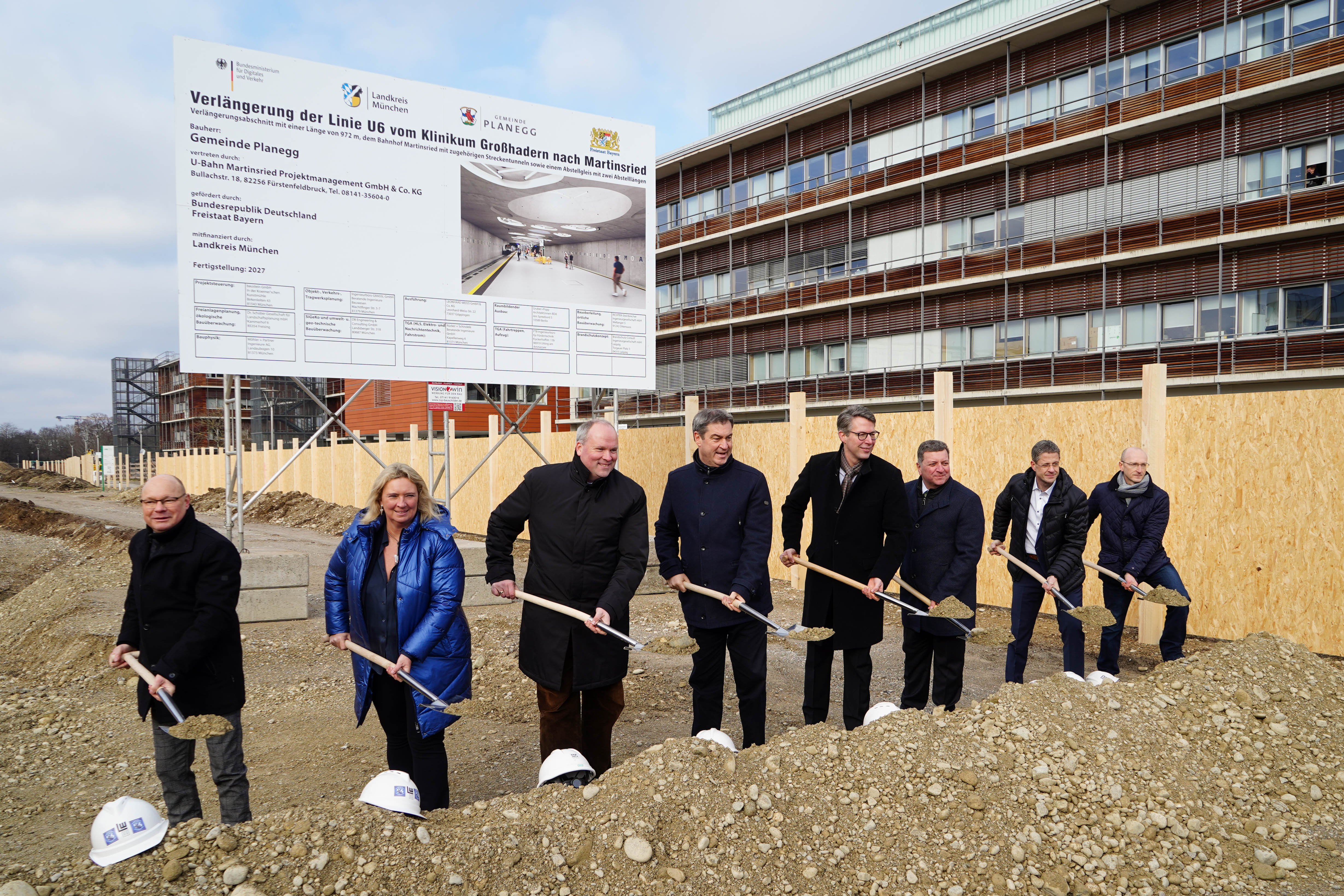 Bayerns Ministerpräsident Dr. Markus Söder hat heute Vormittag gemeinsam mit Verkehrsminister Christian Bernreiter, Wissenschaftsminister Markus Blume, dem Landrat des Landkreises München, Christoph Göbel, dem Ersten Bürgermeister der Gemeinde Planegg, Hermann Nafziger, und dem Geschäftsführer der Projektmanagementgesellschaft (PMG) Dr. Dimitri Steinke, den ersten Spatenstich für die Verlängerung der U-Bahnlinie 6 gesetzt. Zukünftig wird damit der Standort Martinsried, der neben dem Biocampus der Ludwig-Maximilians-Universität (LMU) unter anderem das Max-Planck-Institut für Biochemie (MPIB) und das Innovations- und Gründerzentrum Biotechnologie (IZB) beherbergt, an weitere Münchner Wissenschaftsstandorte wie der Technischen Universität (TU) in Garching und der LMU in der Maxvorstadt angebunden.