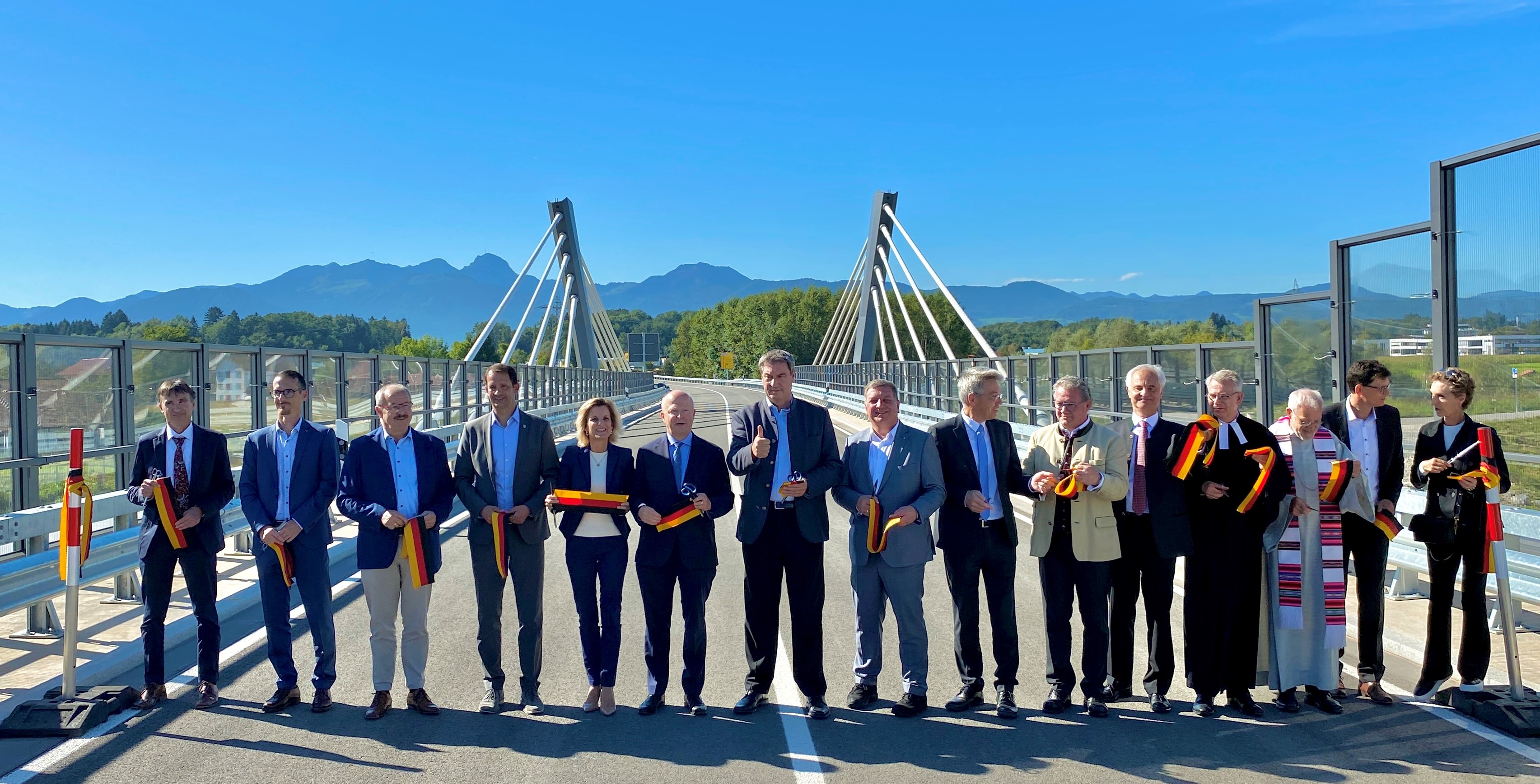 Bayerns Verkehrsminister Christian Bernreiter (8. von links) bei der Teilfreigabe der B 15 Westtangente Rosenheim.