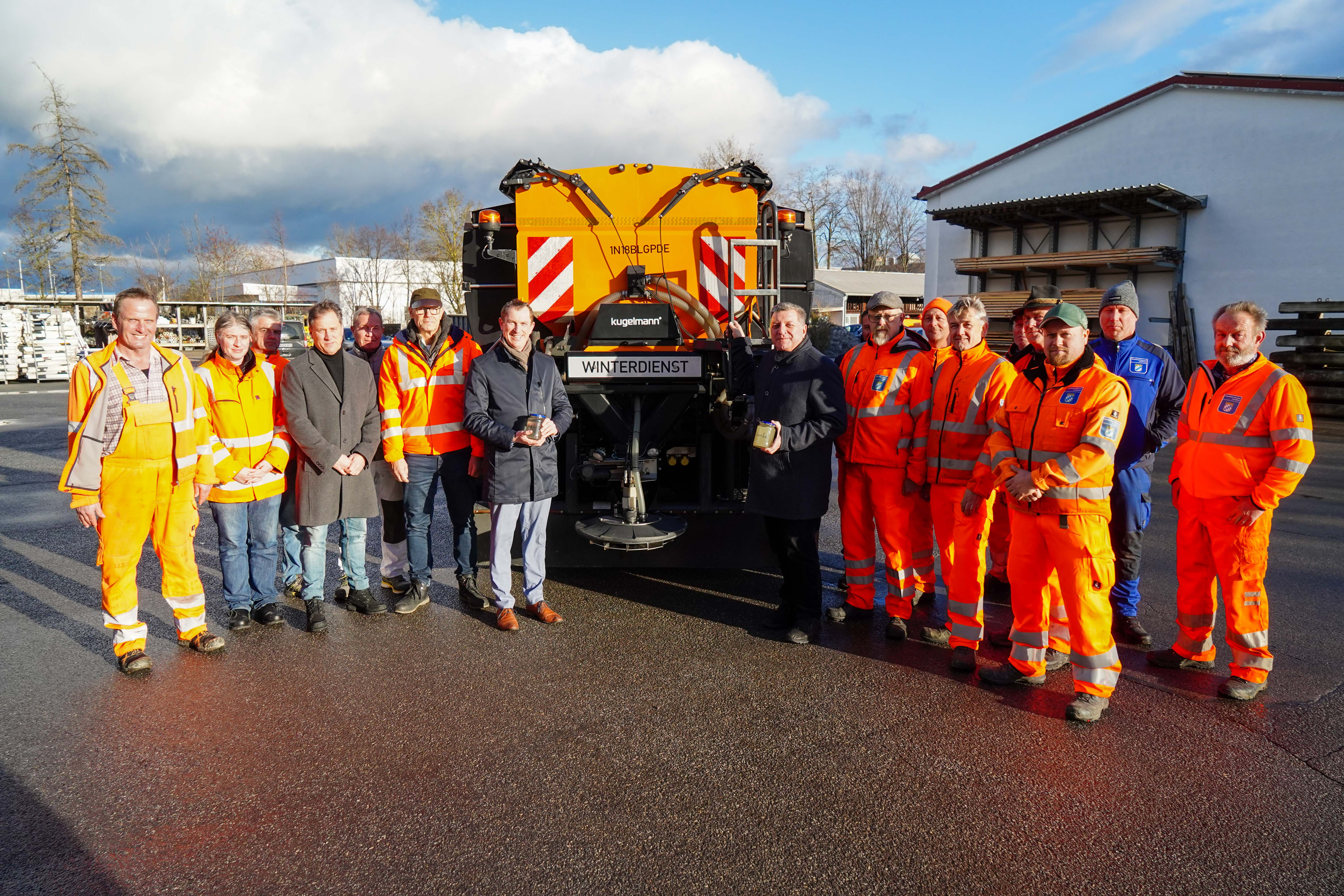 Robert Bayerstorfer, Bereichsleiter Straßenbau des Staatlichen Bauamts Landshut, und Verkehrsminister Christian Bernreiter mit Beschäftigten der Straßenmeisterei Landshut.