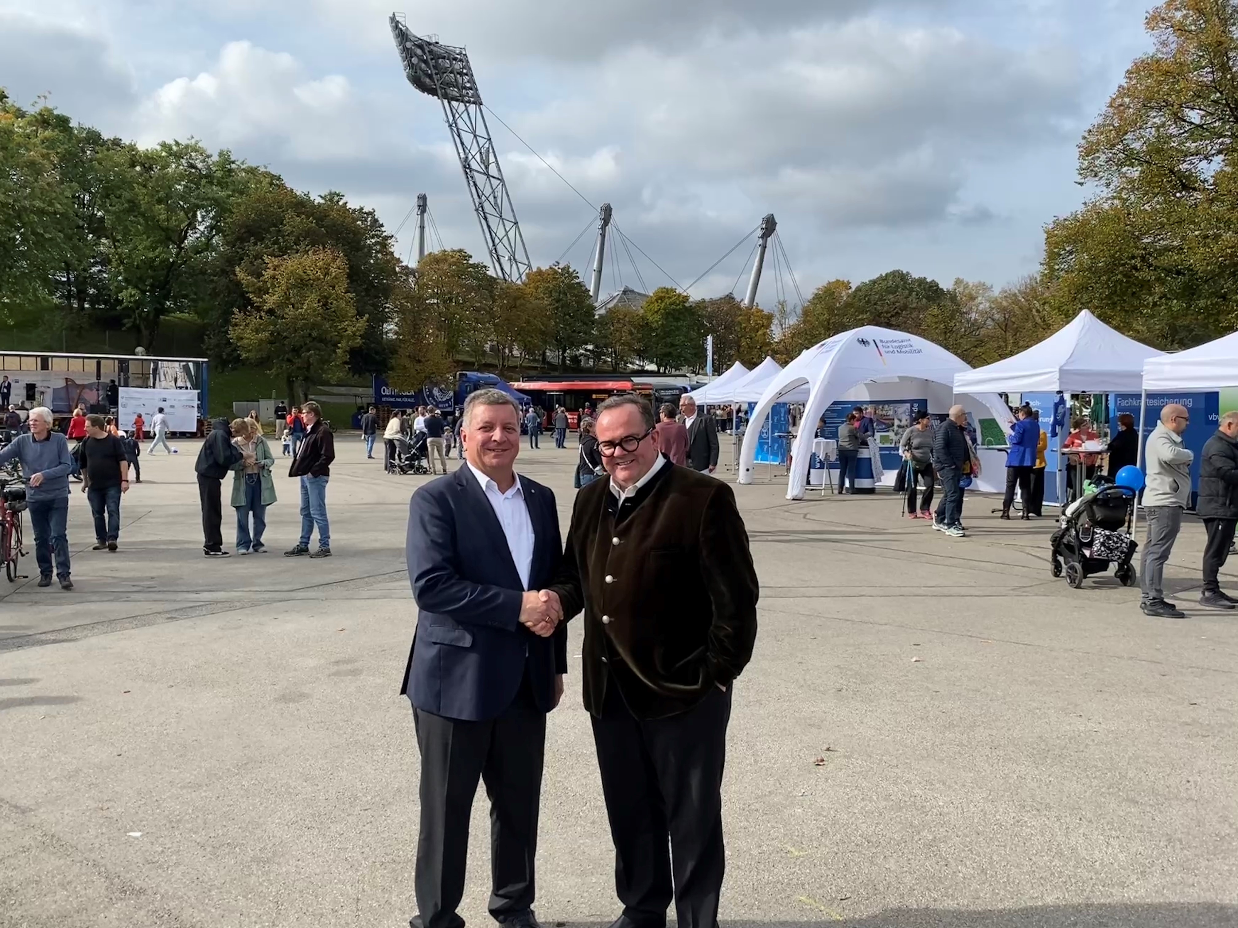 Auf den Fotos zu sehen: Bayerns Verkehrsminister Christian Bernreiter und Münchens Wirtschaftsreferent Clemens Baumgärtner haben sich bei der Veranstaltung „Bayern Gemeinsam Bewegen“ für die Logistik- und Transportbranche eingesetzt.