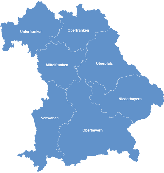 In Bayern gibt es sieben Regierungen. Durch Klick auf die Karte kommen Sie direkt zu der Regierung, die für Sie zuständig ist.