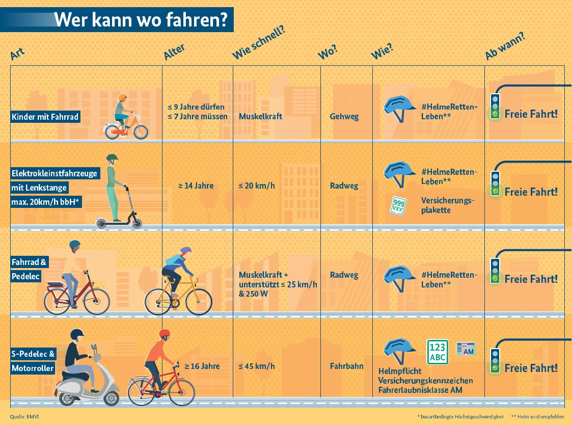 • Elektrokleinstfahrzeuge dürfen innerorts und außerorts nur auf baulich angelegten Radwegen sowie weiteren Radverkehrsflächen (z.B. Radfahrstreifen oder Fahrradstraßen) geführt werden. Dies gilt auch, wenn vorhandene Radwege nicht benutzungspflichtig sind. Nur sofern solche nicht vorhanden sind, darf die Fahrbahn benutzt werden.