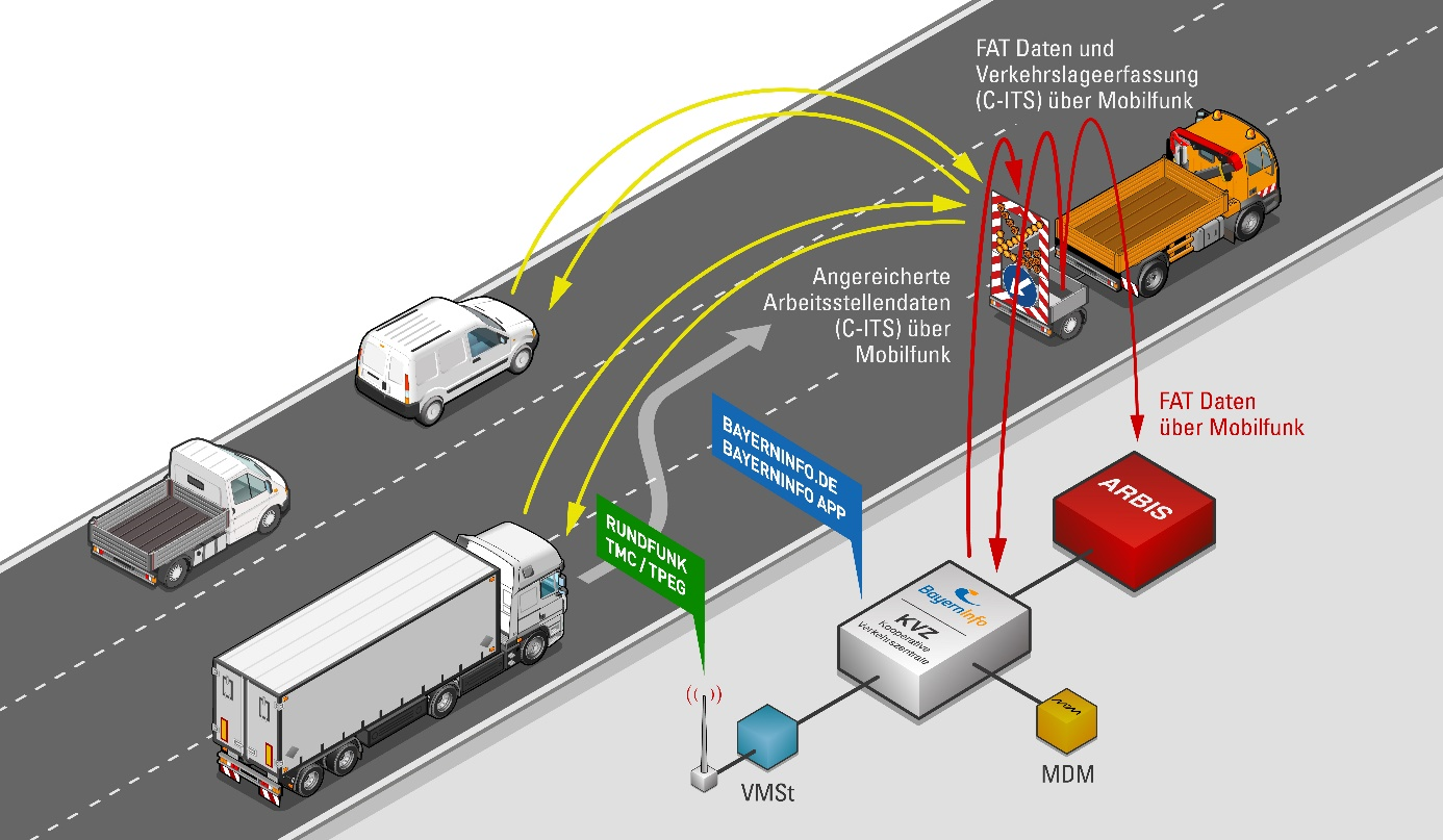 Ein aktuelles Projekt im Rahmen dieser Initiative ist die flächendeckende Vernetzung von Baustellen-Warnanhängern mit Fahrzeugen. Die Anhänger werden so ausgerüstet, dass sie automatisch ihre Position, die Fahrtrichtung und die gesperrte Spur übermitteln können. Diese Daten werden zum einen an BayernInfo und seine Abnehmer gesendet, zum anderen auch direkt über Kurzstreckenkommunikation an sich nähernde Fahrzeuge. Dadurch können Fahrer frühzeitig über die fahrzeugeigenen Anzeigesysteme, insbesondere vor mobilen Baustellen, gewarnt werden.